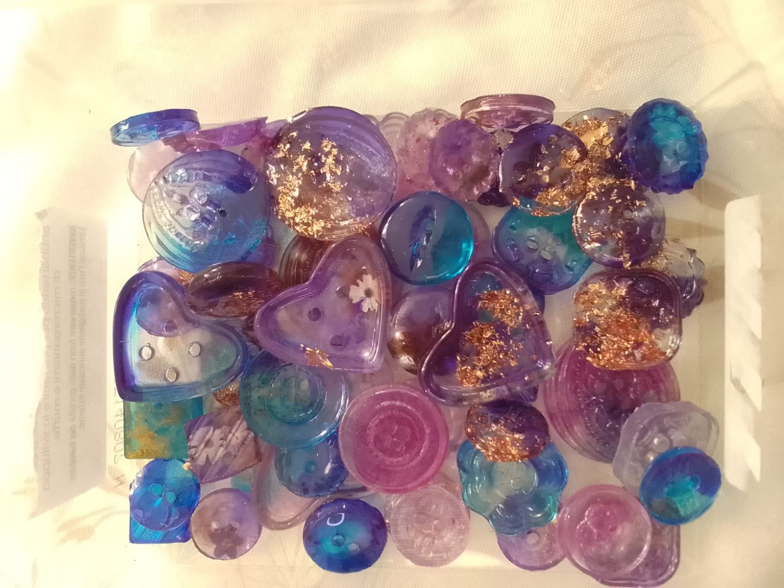 Bottoni in resina di varie misure, forme e disegni. Con sfumature di colori dal rosa al viola, dal blu all'oro della foglia metallica.