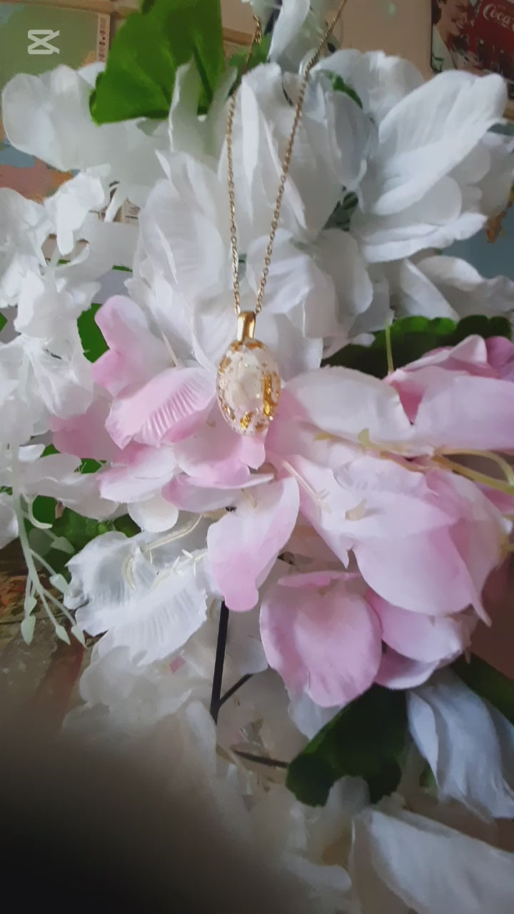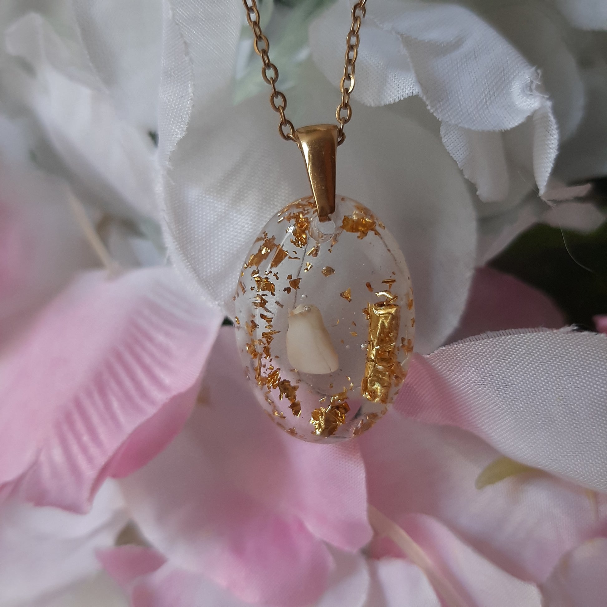 Un gioiello unico e prezioso, realizzato a mano in resina trasparente con foglia oro e il dentino da latte del tuo bambino.