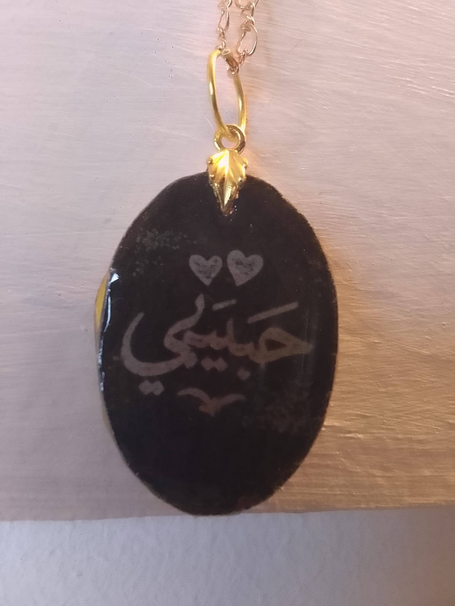 Ciondolo da donna con cuore in gesso, rivestito in resina. decorato in stile egiziano, misure cm. 3,5 x 2,5 x 0,5. La scritta sul retro del ciondolo ha un significato pari a "amore mio" - "tesoro".