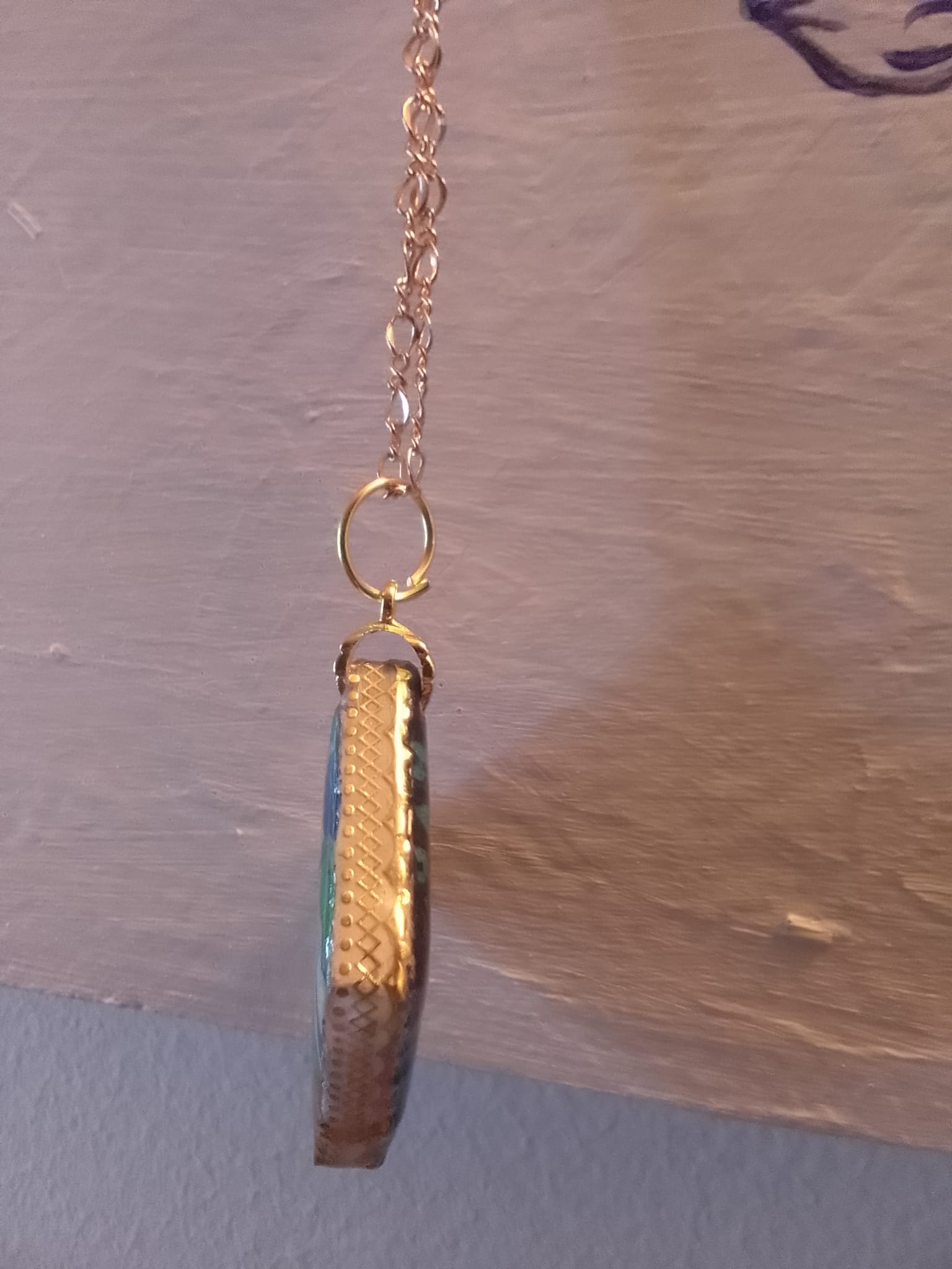 Ciondolo-rombo da donna con cuore in gesso, fiori dipinti a mano, decorazioni dorate e rivestito in resina, misure cm. 3,5 x 2,8 x 0,5.