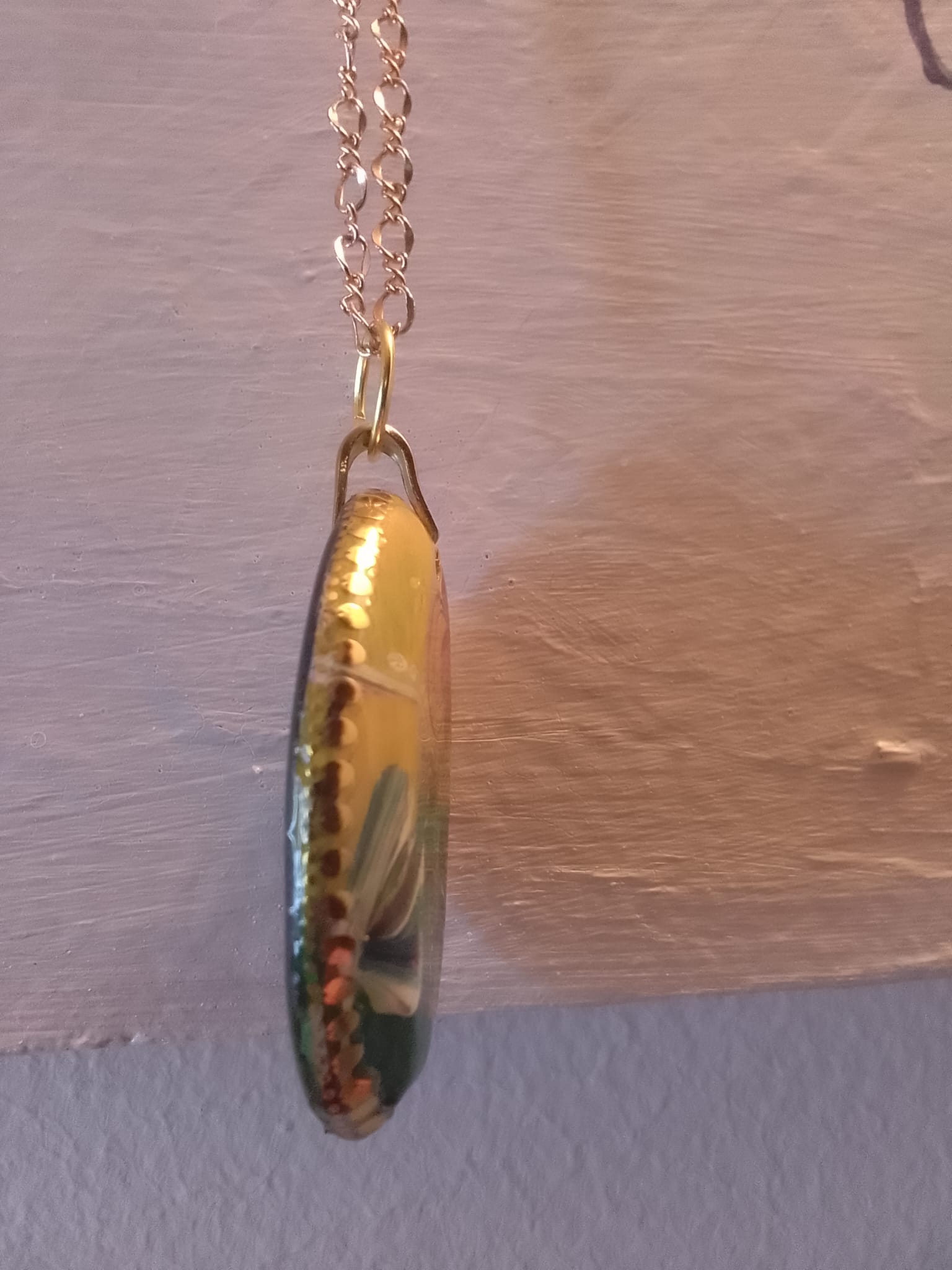 Ciondolo da donna realizzato in gesso, dipinto a mano, con scritta incisa con laser, il tutto rivestito con resina epossidica UV. Gancio dorato. Le misure sono cm 3,5 X cm 2,5