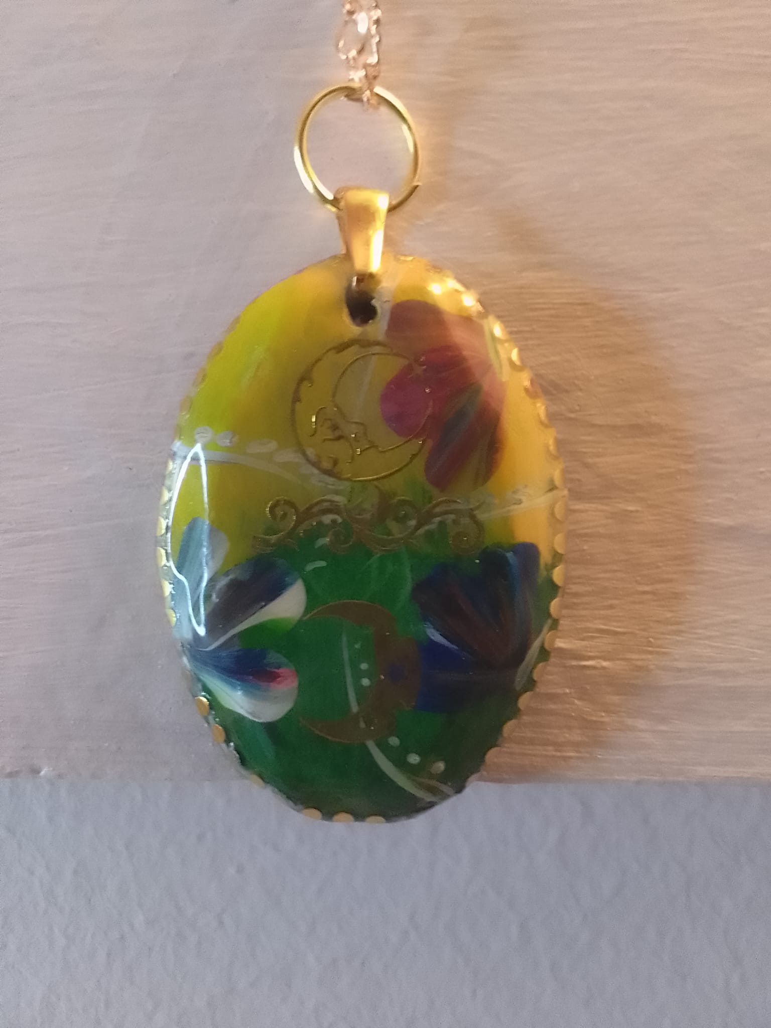 Ciondolo da donna in gesso, dipinto a mano, con decorazioni dorate ed incisioni