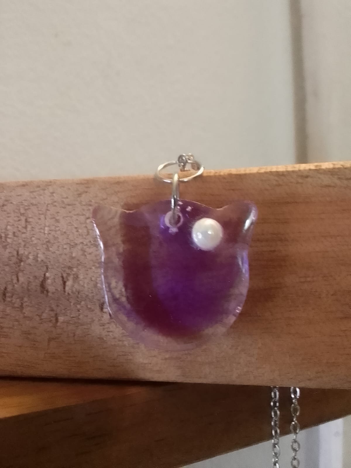 Ciondolo in resina viola con perla bianca incastonata, a forma di gatto. Leggero da indossare.