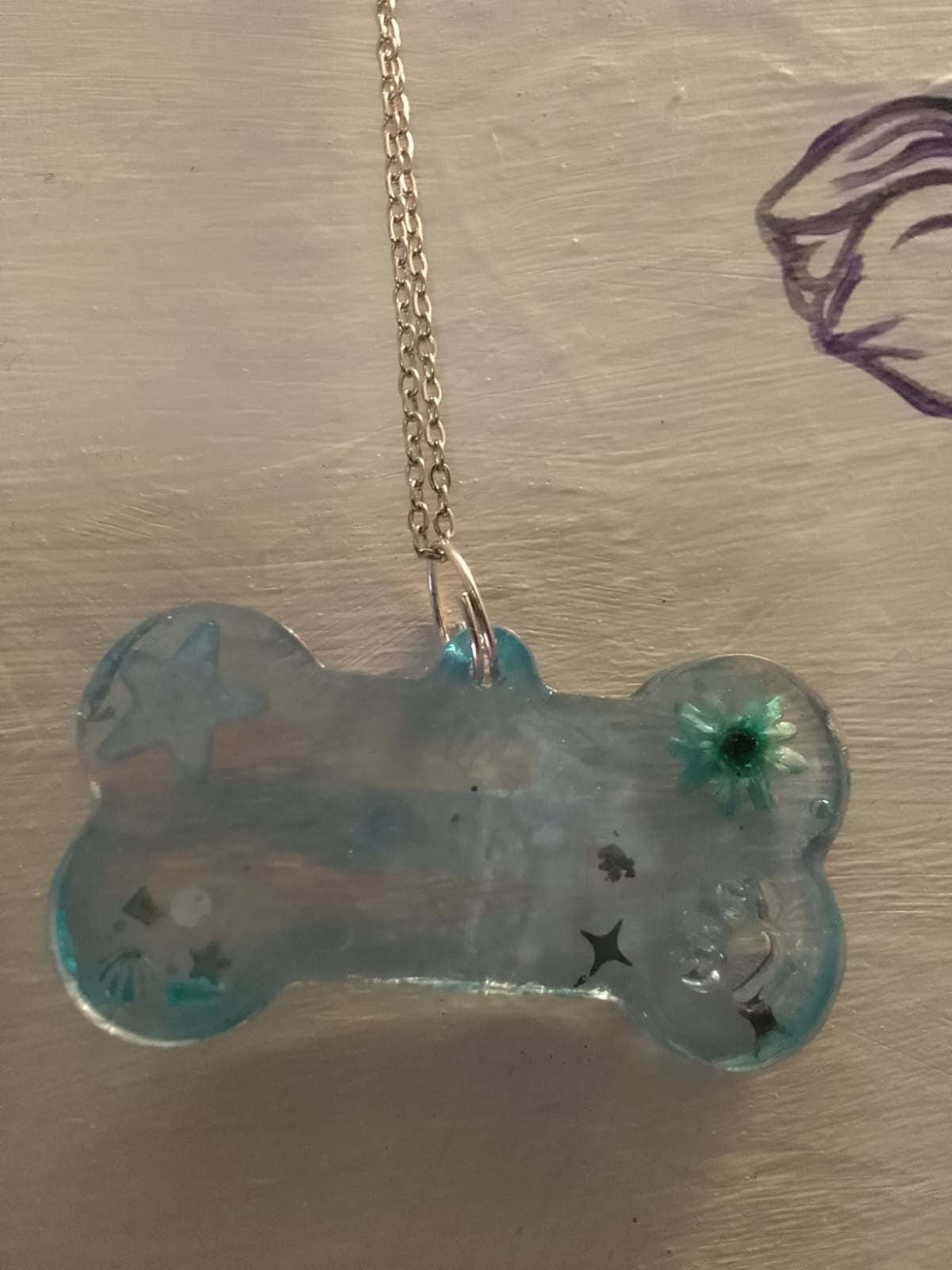 Medaglietta per cani in resina trasparente a forma di osso decorata con fiori secchi.