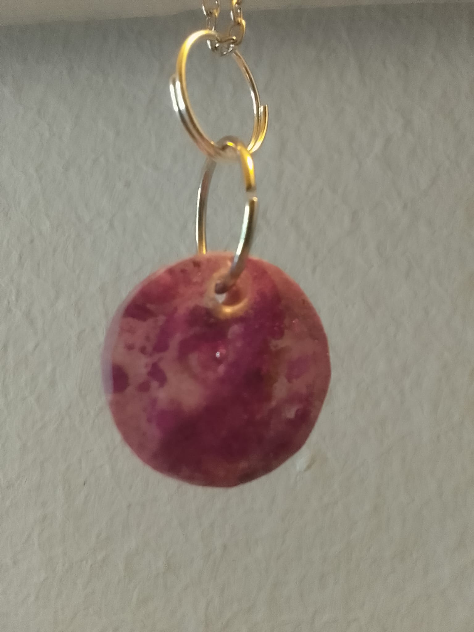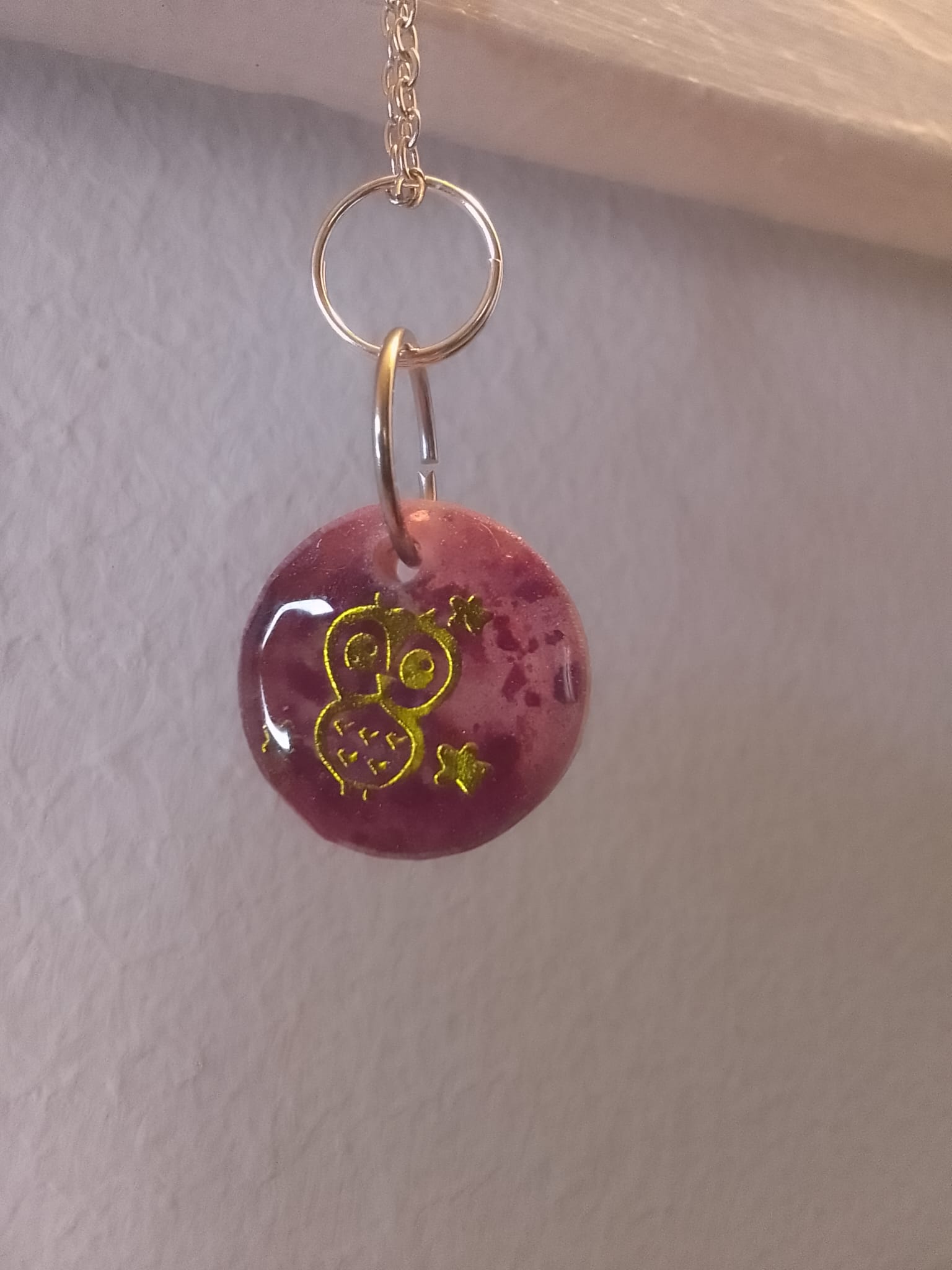Ciondolo in resina da donna di forma rotonda misura cm. 1,5 x 1,5 x 0,5, colore marroncino, raffigurante un gufetto dorato. Ciondolo leggero adatto anche a ragazzine.
